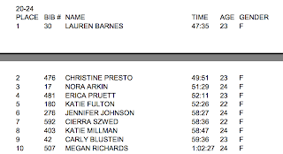 Like I've always said, running isn't the best feeling. People run for the accomplishment you feel and knowing you can push yourself. After this race, I felt like I was about to barf. I couldn't feel my feet, my stomach was in knots and I didn't know how I was going to walk all the way back (a whole 2 blocks) to my car. But, I was amazed that I pushed myself, that I placed 2nd in my age/gender group, and that I had blasted my previous PR. The course was extremely hilly, and at the end I knew I had given the race all I had. I can't wait to accomplish the challenge of beating this new PR.